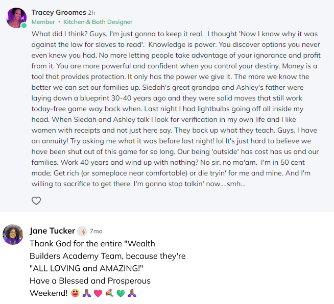 "The Wealth Builders Academy was an experience like no other. It challenged me mentally, financially and emotionally. It allowed me the opportunity to connect with like minded individuals who want to build their financial wealth & set their family up for a better financial future. It pushed me to be more mindful and intentional in all aspects of my life. The WBA pushed me to focus on my self limiting beliefs & mentality. It made me step outside of my comfort zone in order to grow as an individual. It allowed me to see what I can accomplish if I allow myself to dream big. It helped me find the direction to do what I want in life. It taught me that I am worth the investment I made in myself."